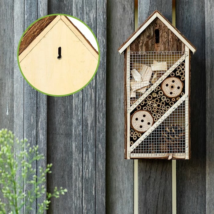 - Grand rassemblement : hôtel à insectes en bois avec différentes sections et dispositif de suspension spécial