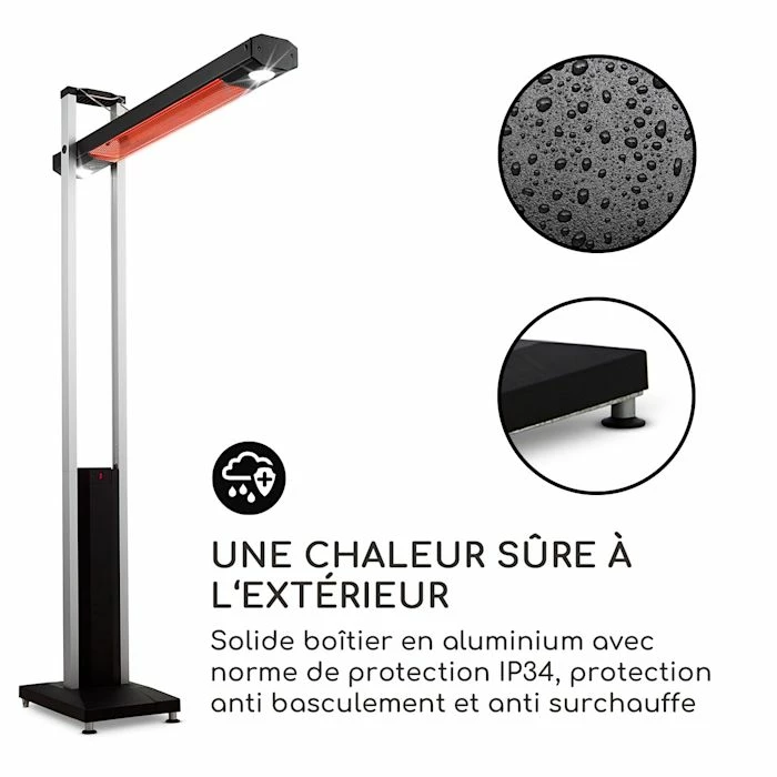 - Solide corps en aluminium résistant aux intempéries avec protection anti basculement et anti feu
