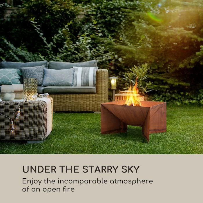 Profitez de l’atmosphère incomparable d’un feu ouvert sous les étoiles avec le brasero Desert Rust Square de blumfeldt.