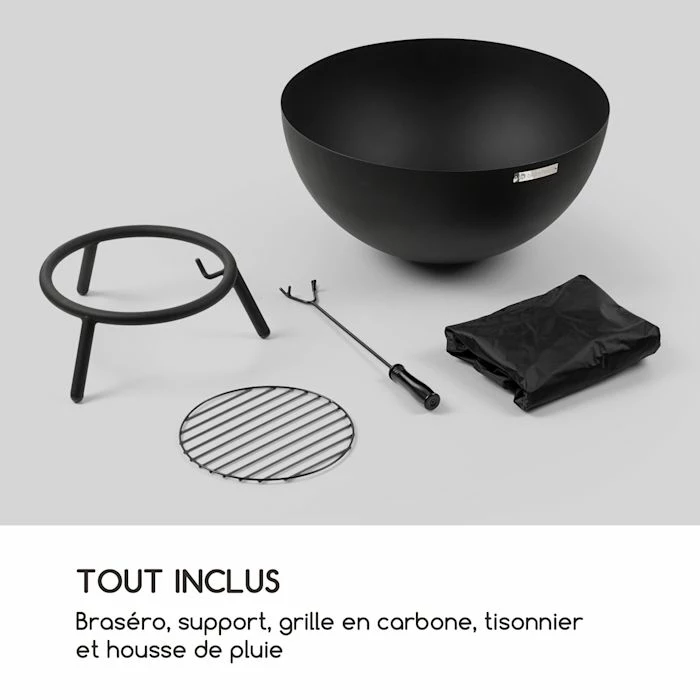 - Complet : braséro, trépied, grille à charbons, tisonnier et housse contre la pluie