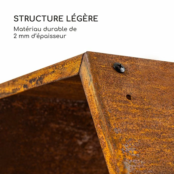 - Construction lĂ©gĂšre : matĂ©riau durable de 2 mm d’Ă©paisseur, couleur noire ou rouille.