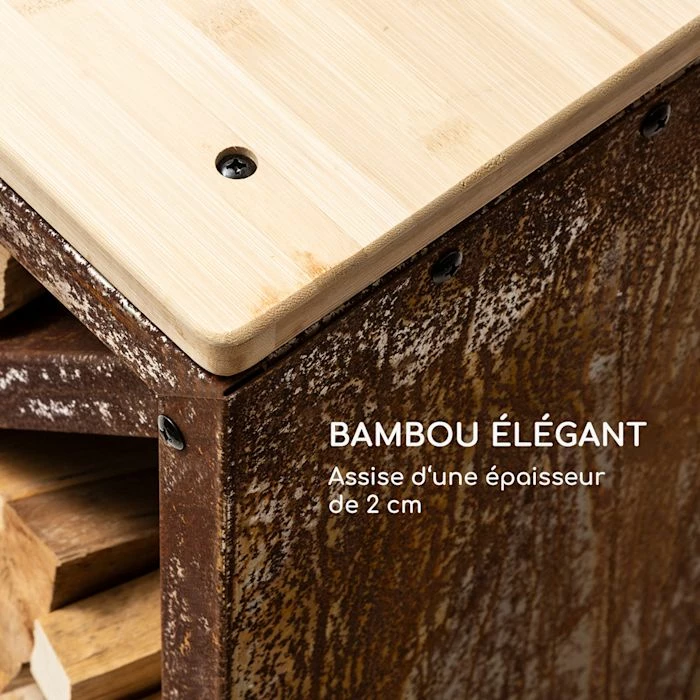 Qui n’aime pas s’asseoir près d’un feu de cheminée crépitant et qui réchauffe ? Avec le blumfeldt Firebowl Kindlewood L Rust, tu peux te détendre en tout confort : Les bûches pour le feu sont à portée de main. Parce que tu es littéralement assis dessus. Le meuble de rangement pour le bois ne t’offre pas seulement une option de rangement moderne et peu encombrante, il sert également de banc confortable. Il impressionne également par son magnifique design puriste fait d’acier et de bambou attrayants. Son aspect luxueux n’est complété que lorsque tu empiles les bûches à l’intérieur du banc, car le bois s’harmonise parfaitement avec les matériaux. Les séparateurs diagonaux complètent le look exclusif et t’aident à empiler le bois de chauffage. Ils garantissent également que votre tas de bois ne s’effondrera pas dès que tu sortiras une bûche.