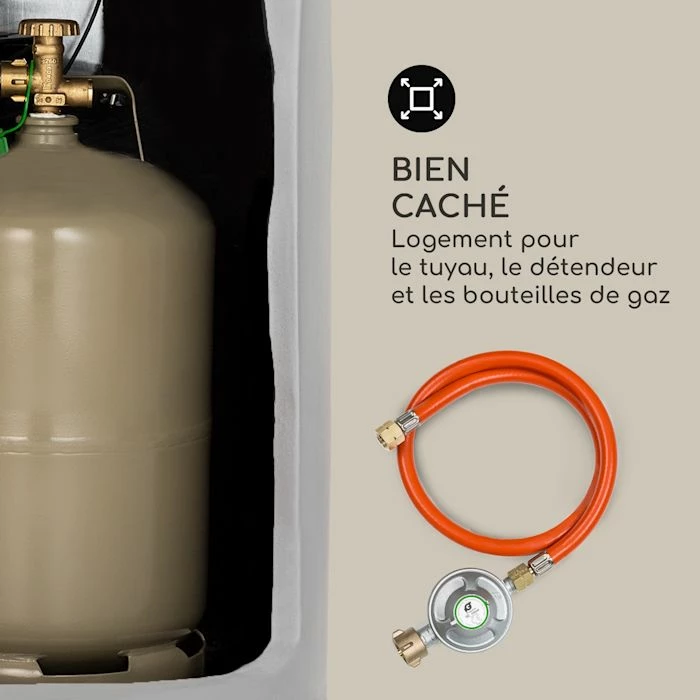 - Bien caché : Logement pour le tuyau, le détendeur et les bouteilles de gaz
