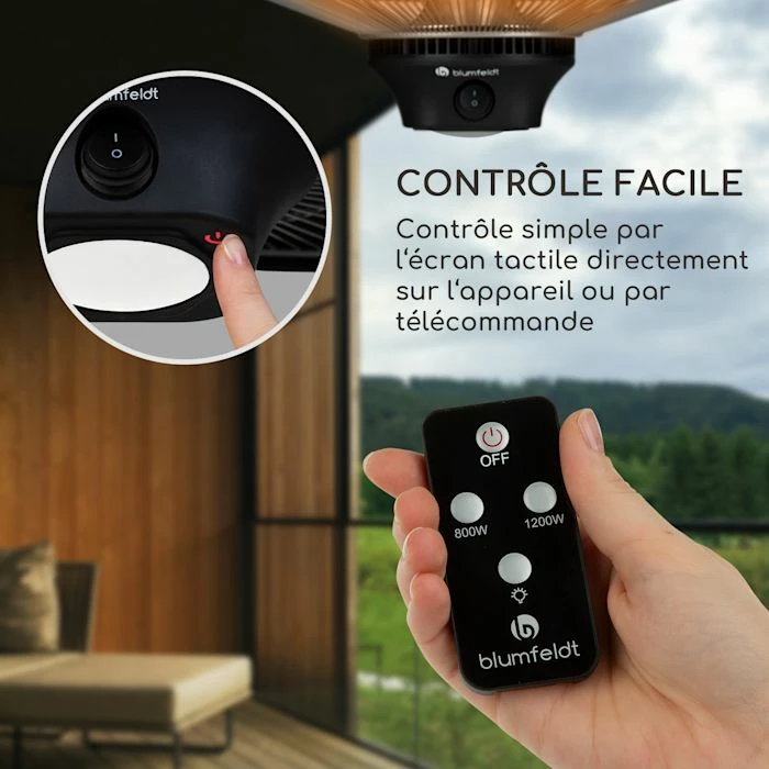 - Puissance sur demande : radiateur de plafond avec 3 niveaux de puissance à 800, 1200 et 2000 watts