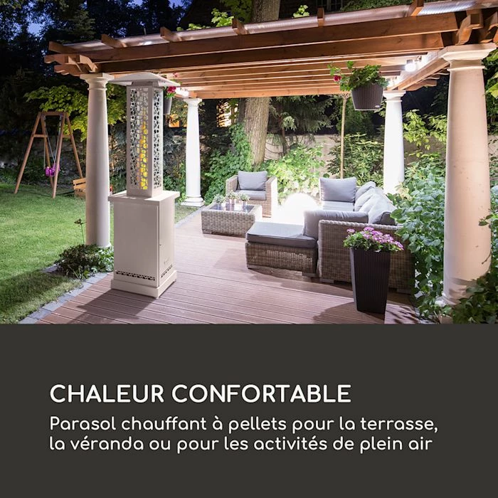 - Une chaleur agréable : parasol chauffant à granulés pour la terrasse, la véranda ou pour les activités à l’extérieur