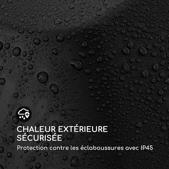 - Une chaleur sûre à l’extérieur : protection contre les éclaboussures avec IP45