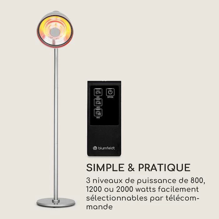 - Simple & pratique : 3 niveaux de puissance de 800, 1200 ou 2000 watts facilement sélectionnables par télécommande