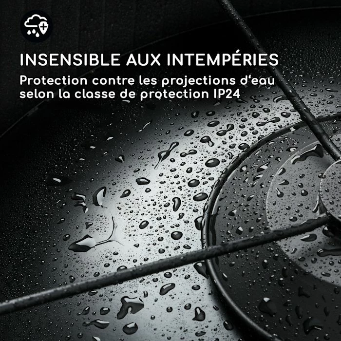 - Résiste aux intempéries : résiste aux projections d’eau avec la norme IP24