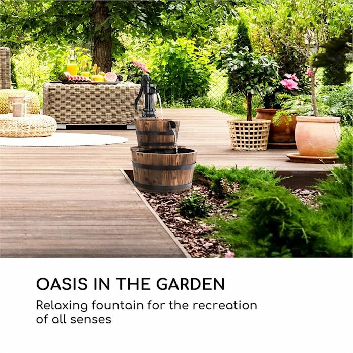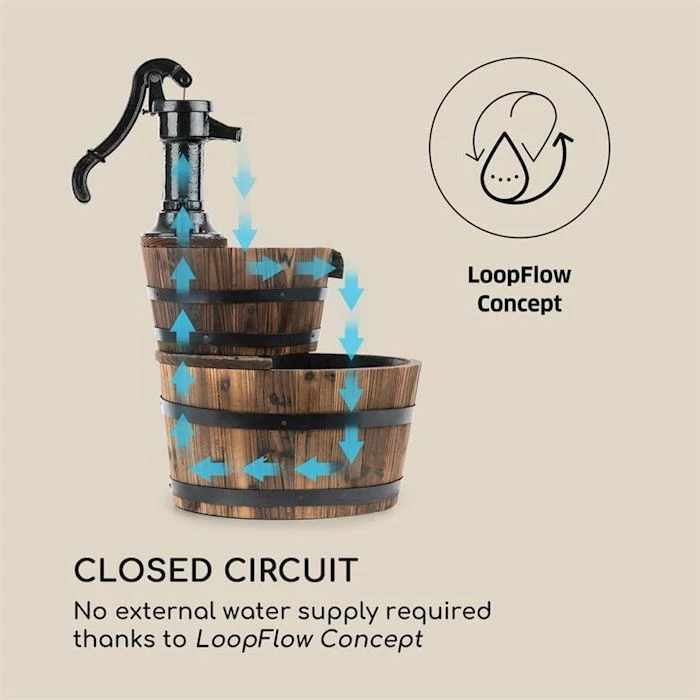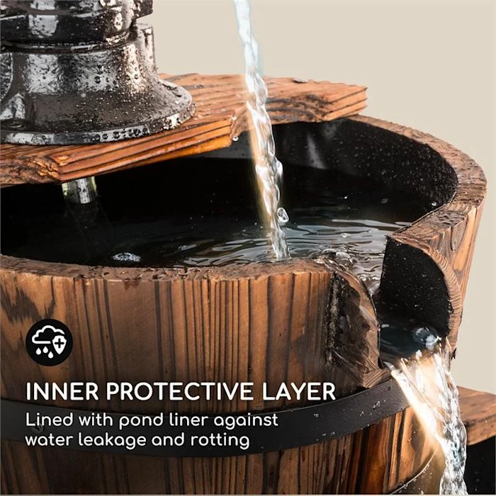Deux niveaux en robustes bassins en bois mènent à une tour effilée surmontée d’une pompe à bascule décorative en fonte peinte en noir. Les deux barils massifs de la fontaine ornementale sont en bois de sapin au grain magnifique et ont été artificiellement vieillis par un traitement à la flamme. Pour que l’eau reste en toute sécurité dans les récipients et que le bois soit protégé contre la pourriture, l’intérieur des cuves est tapissé de doublure de bassin.