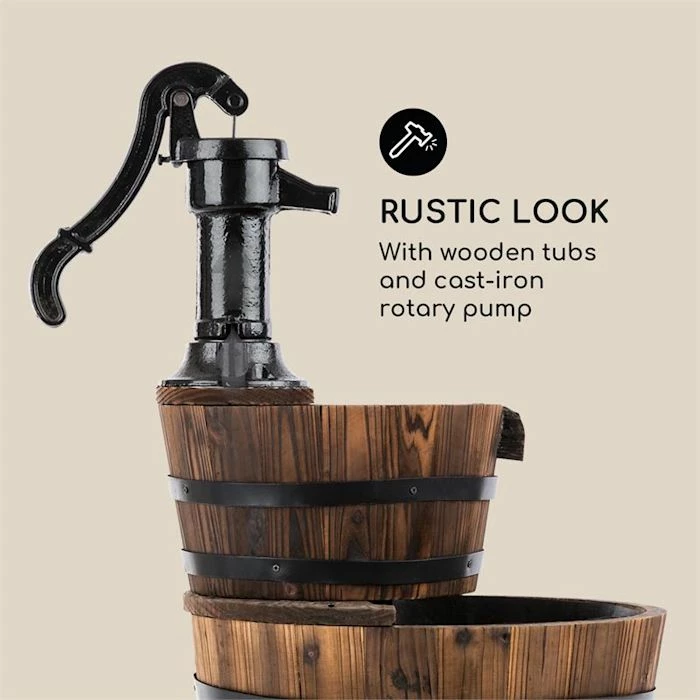 - Look rustique : avec cuve en bois et pompe pivotante en fonte