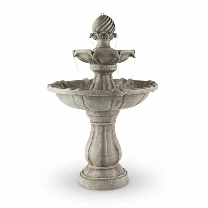 Lâeau part de la pointe puis se dĂ©verse dans le bassin de 30 cm puis dans celui de 60 cm. Puis lâeau remonte grĂące Ă la pompe Ă©lectrique. De lĂ , il se produit au moyen d’une pompe Ă©lectrique Ă nouveau sur son chemin dans l’air. La fontaine attirera les oiseaux et produira ainsi une ambiance agrĂ©able.