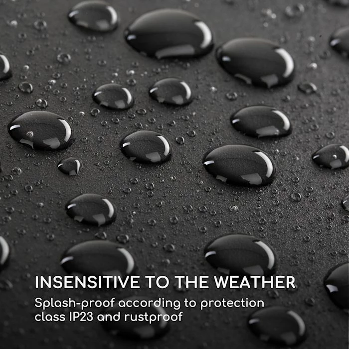 - Résiste aux intempéries : étanche aux éclaboussures selon la norme de protection IP23 et antirouille