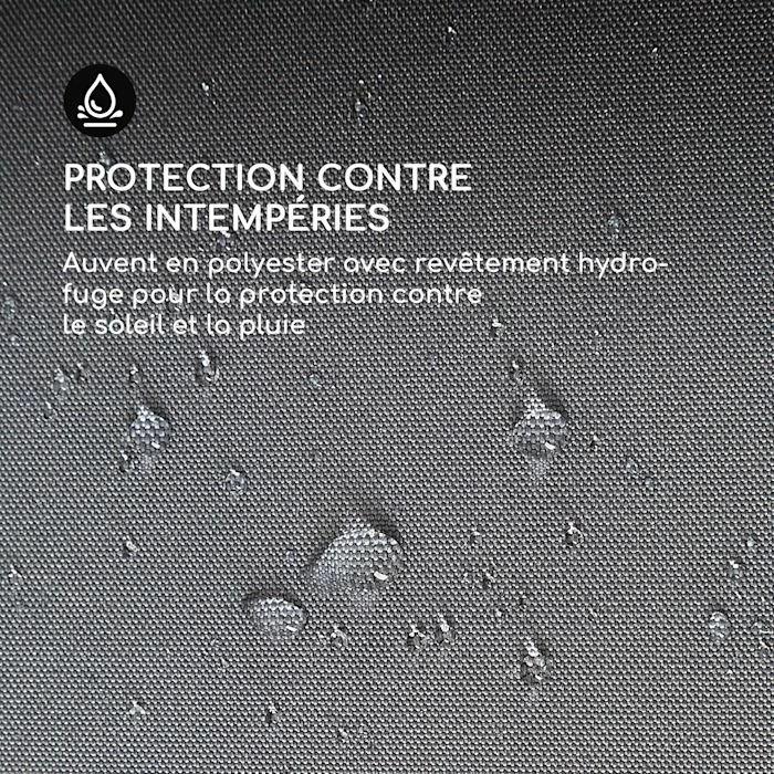 - Résistant aux intempéries : toiture en polyester avec revêtement déperlant protégeant contre le soleil et la pluie