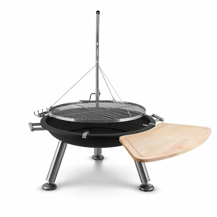 Le grill pivotant Turion de Blumfeldt offre tous les avantages dâun grill en suspension. AccrochĂ©e Ă un cĂąble robuste, sa grille de 70 cm peut tourner Ă volontĂ© au-dessus dâun feu ou de braises, rĂ©duisant fortement le risque de brĂ»lure de vos aliments. Une manivelle permet de rĂ©guler la distance entre la grille et le feu de maniĂšre simple, sans vous brĂ»ler les doigts. Si vous prĂ©fĂ©rez un positionnement fixe de la grille, celle-ci peut ĂȘtre abaissĂ©e sur quatre supports stables placĂ©s sur le bord du brasero. Une bordure de sĂ©curitĂ© retranchĂ©e Ă©vite que les saucissons et autres aliments ronds nâatterrissent dans le brasier.