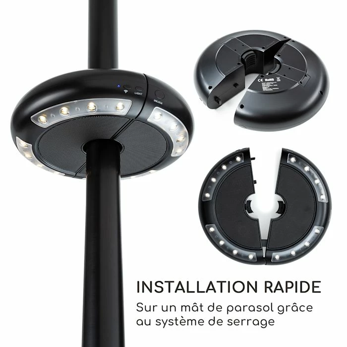 - Installation rapide : sur le mât du parapluie grâce à un système de tension