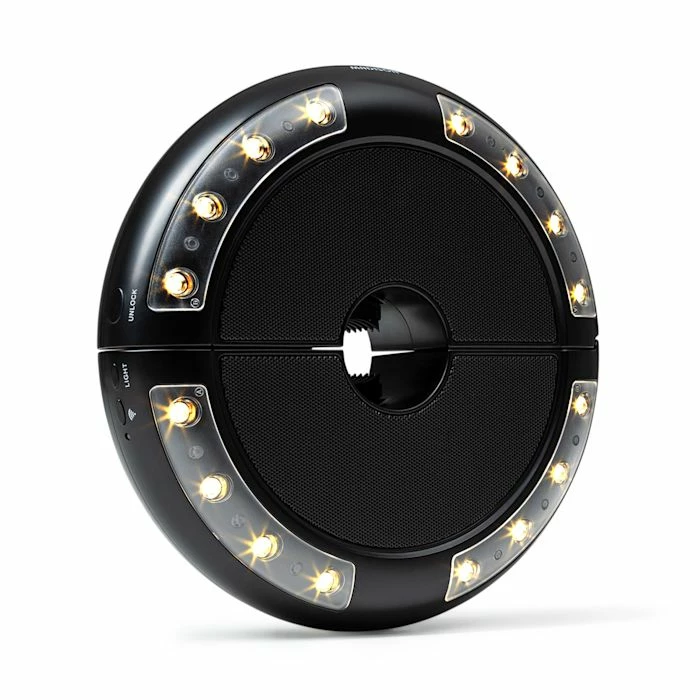 Profitez des heures d’été sous le parasol : l’enceinte parasol St. Tropez de blumfeldt vous donne de la lumière le soir et accompagne vos moments en plein air avec la bonne musique ou un livre audio passionnant. Pour cela, il vous suffit de clipser le haut-parleur rond et pratique avec la lumière LED sur votre parasol de jardin. Il suffit de le déplier latéralement, de le placer autour du mât rond du parasol et de le laisser se remettre en place – le bouton de verrouillage assure un maintien sûr. Deux ressorts de compression flexibles maintiennent fermement l’anneau d’enceinte sur l’écran et permettent de le fixer à des poteaux ronds d’environ 35 à 50 mm.