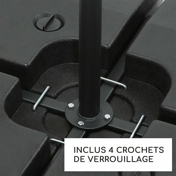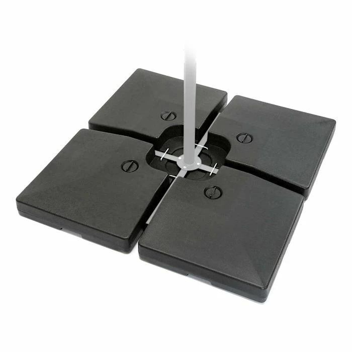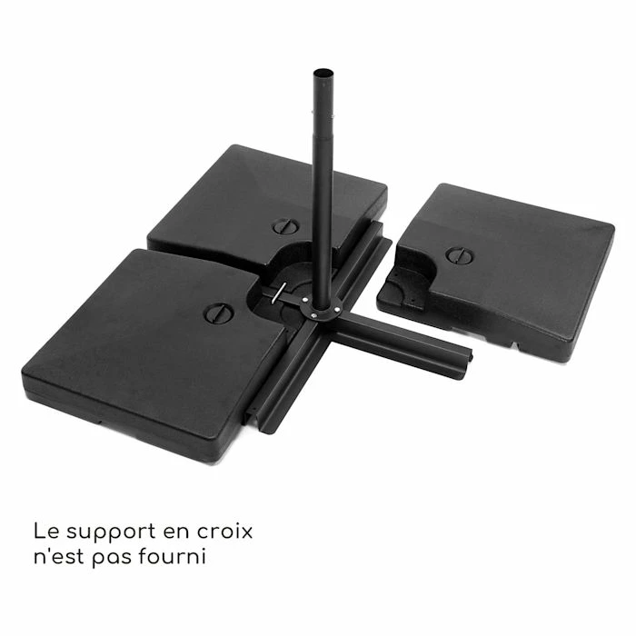 Pour qu’aucun vent ne vienne faire vaciller votre parasol : les poids ingénieux du support de parasol Limousin de blumfeldt promettent une stabilité maximale et un maintien sûr. Vous pouvez les remplir d’eau ou de sable à votre guise afin qu’ils pèsent sur votre porte-parapluies à la croix de la base.