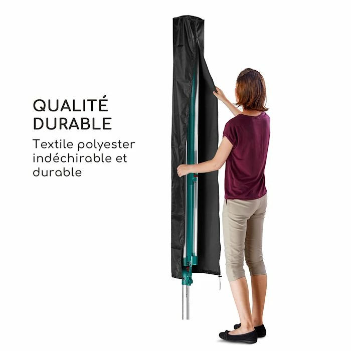 Avec la housse de protection pour séchoirs rotatifs Shield Drying Rack de blumfeldt, prolongez la fonctionnalité de votre séchoir rotatif pendant de nombreuses années. Fabriqué dans un matériau spécial en polyester il est particulièrement résistant aux intempéries et durable. Ainsi, même les rayons UV ne passent pas et la neige et la glace n’ont aucune chance d’endommager votre séchoir rotatif. Les salissures de l’environnement sont également évitées de manière astucieuse grâce à la housse de séchoir à linge rotatif.