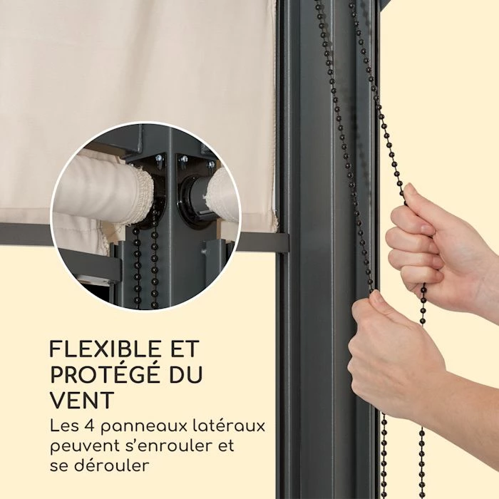 - Flexible et à l’abri du vent : les 4 panneaux latéraux sont enroulables de haut en bas
