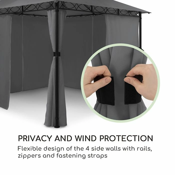 - Protection visuelle et contre le vent: agencement flexible des 4 ailes latérales grâce aux rails de roulement, fermetures à glissière et bandes de fixation