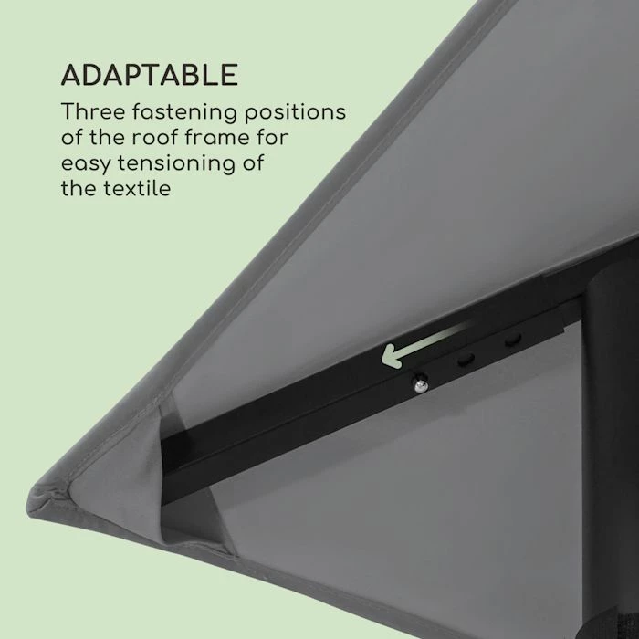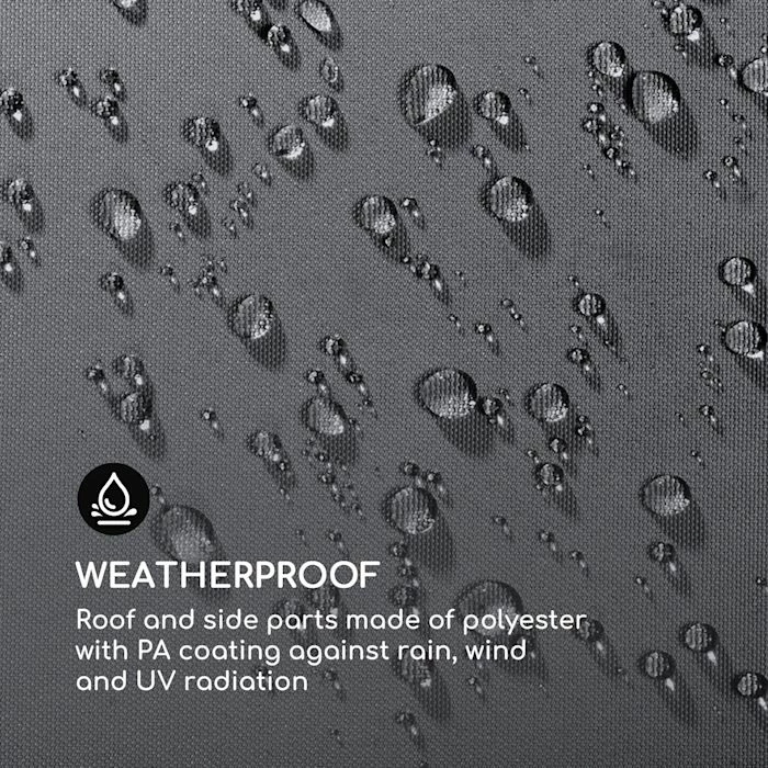 - Protection contre les intempéries : toit et ailes latérales en polyester avec revêtement PA contre la pluie, le vent et les rayons UV