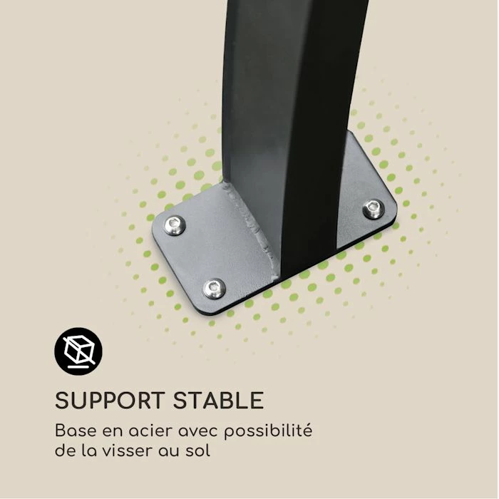 - Très stable : base en acier avec possibilité de vissage au sol