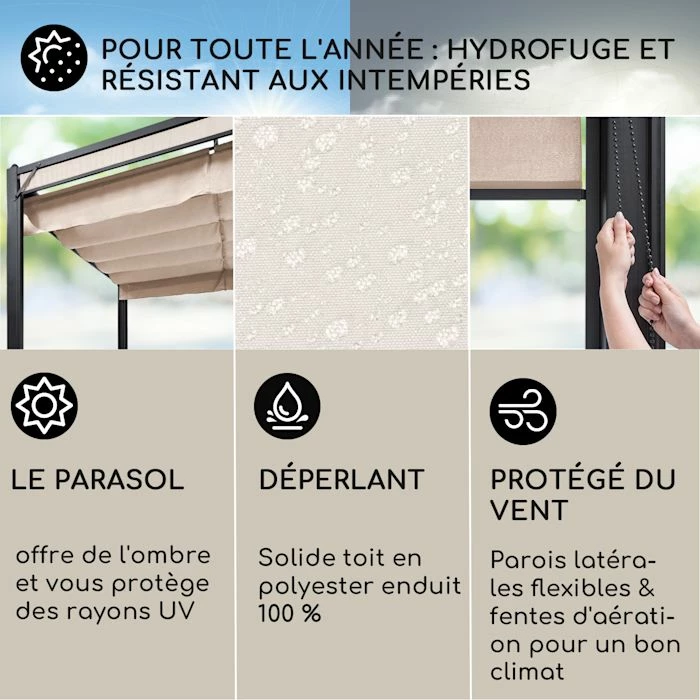 - Polyvalent et à l’abri du vent : les 4 parois latérales sont enroulables