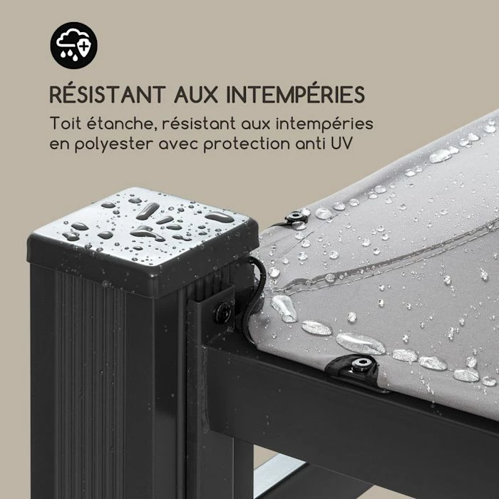 - Résistant aux intempéries : auvent en polyester hydrofuge et résistant aux intempéries avec protection anti UV
