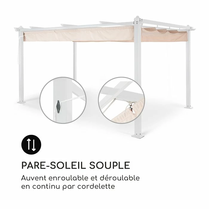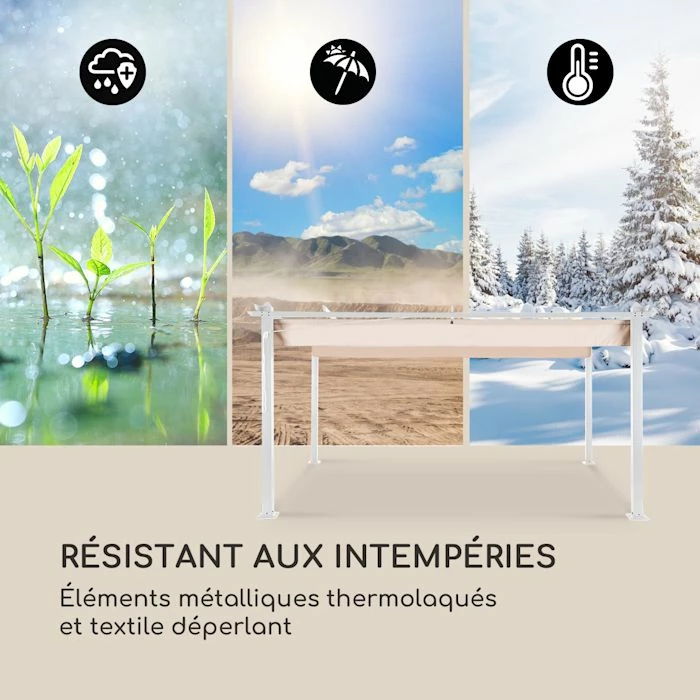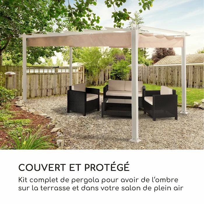 - Couvert et protégé : ensemble complet de pergola offrant de l’ombre pour les terrasses et aires de repos extérieures
