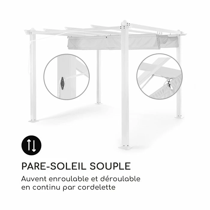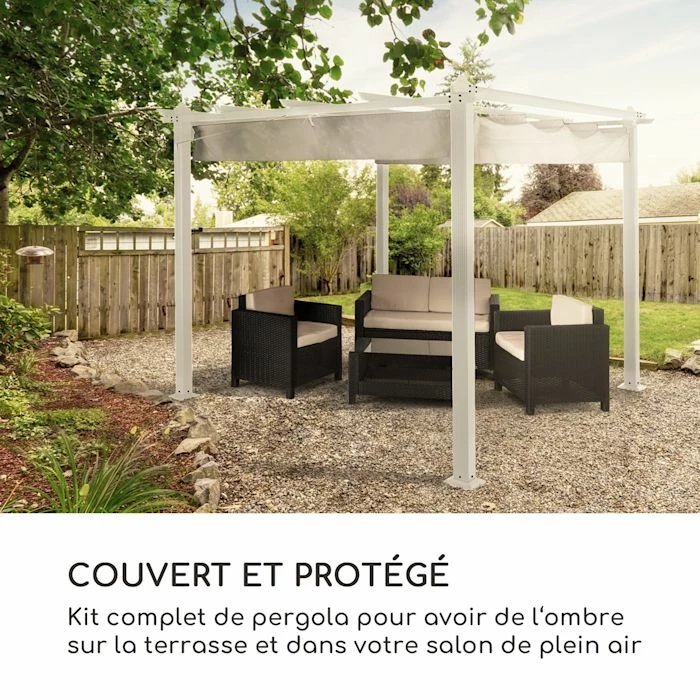 - Couvert et protĂ©gĂ© : ensemble complet de pergola offrant de l’ombre pour les terrasses et aires de repos extĂ©rieures