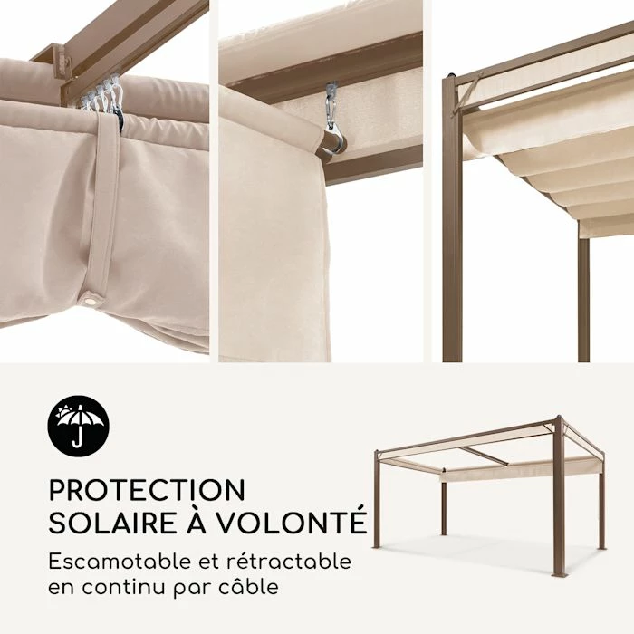 - Ombrage à volonté : le toit peut être déployé et rétracté en continu grâce à un câble de traction.