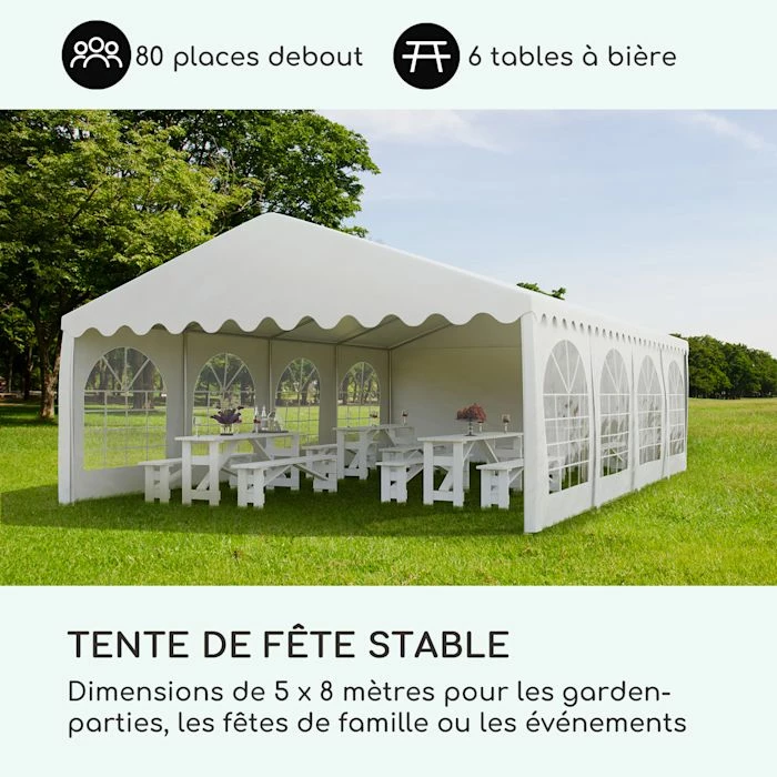 - Tente de fête stable : dimensions de 5 x 8 mètres pour les garden-parties, les fêtes de famille ou les événements