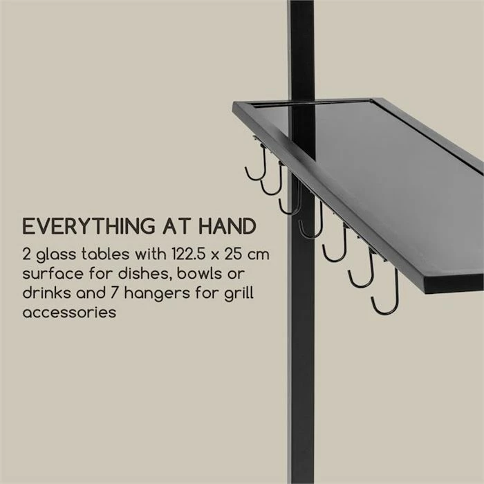 - Tout à portée de main : 2 tablettes en verre de 122,5 x 25 cm pour la vaisselle, les saladiers ou les boissons et 7 crochets pour les accessoires de barbecue