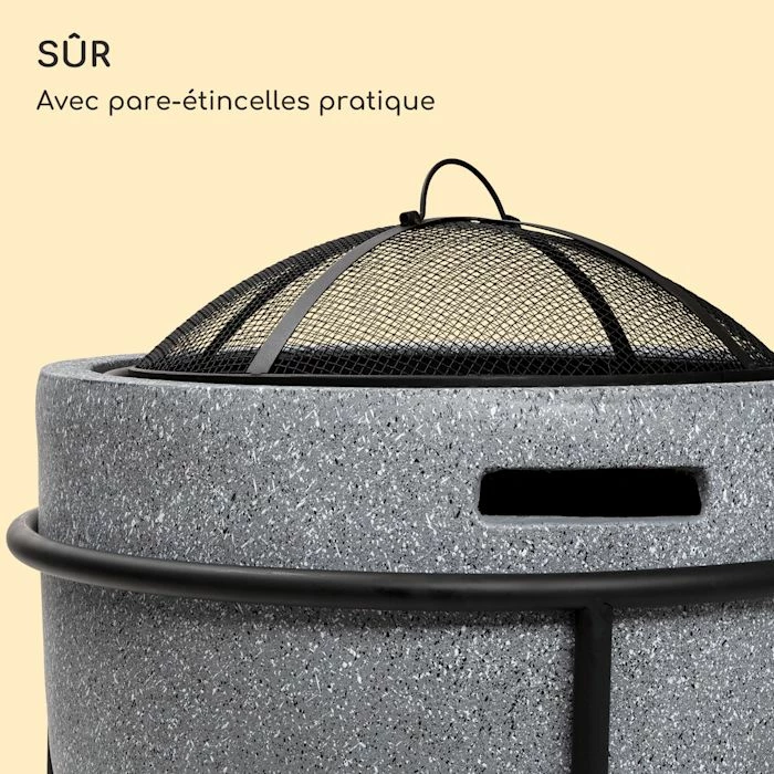 - Complet : avec pare-étincelles, foyer en acier, grille à charbon, grille de cuisson et bras de préhension