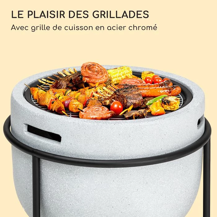 - Complet : avec pare-étincelles, foyer en acier, grille à charbon, grille de cuisson et bras de préhension