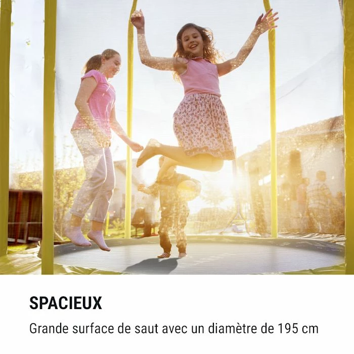 - Beaucoup d’espace : Grande surface de saut de 195 cm de diamètre