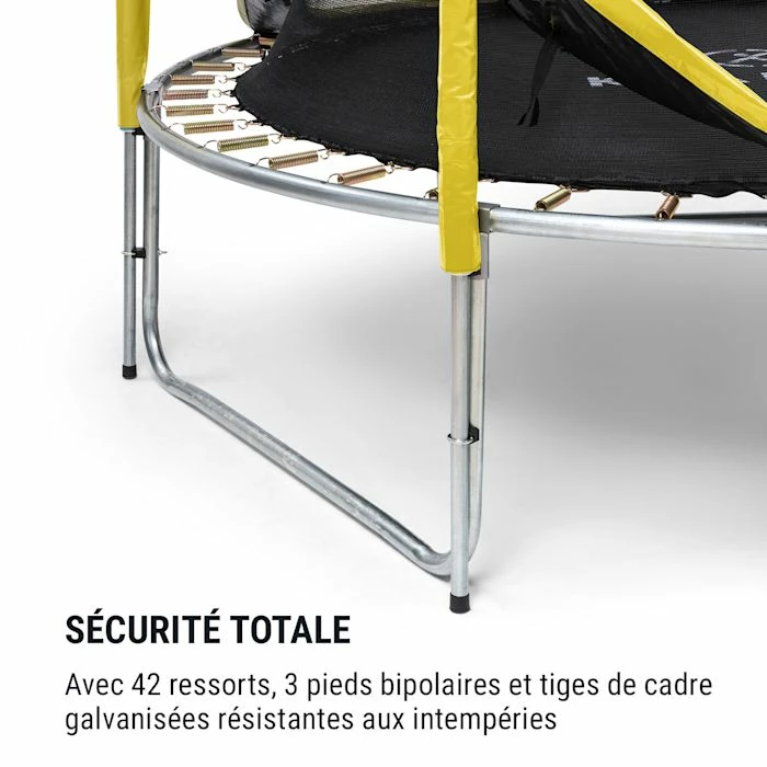 - Sécurité totale : grâce à 42 ressorts, 3 pieds doubles et des barres de cadre galvanisées et résistantes aux intempéries