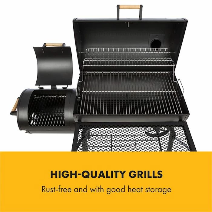 Ainsi, avec ce barbecue vous pourrez non seulement faire des grillades sur la grille de cuisson, mais aussi cuire lentement, cuire au four ou fumer. Pour cela, le Beef Brisket a deux chambres de gril séparées. Dans la petite chambre, vous pouvez faire brûler le bois dont la fumée passe par un tuyau de raccordement dans la grande chambre de cuisson et la viande, le poisson ou les légumes cuisent lentement et doucement en prenant le goût unique de la fumée. Si vous le souhaitez, vous pouvez en même temps faire griller les aliments. Un thermomètre intégré au couvercle indique la température intérieure pour vous tenir informé en permanence.