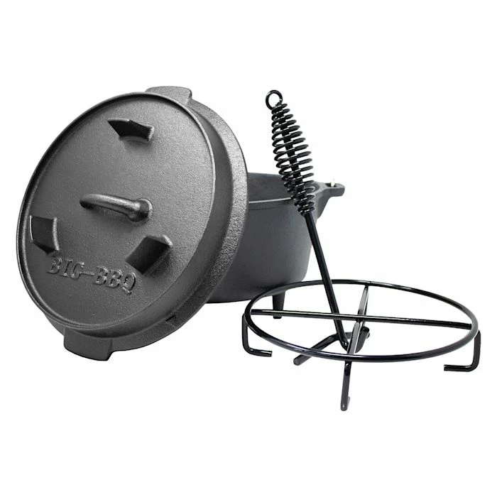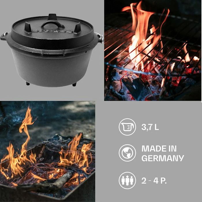 Toujours un fer chaud sur le feu : le four hollandais Guernsey Premium de Klarstein peut être utilisé universellement pour cuisiner, braiser, rôtir, cuire et frire et peut être chauffé avec des briquettes, les braises d’un feu de camp ou comme pot sur le barbecue. Cet appareil rustique polyvalent est pré-cuit et prêt à cuire. La fabrication en fonte assure une répartition optimale de la chaleur. Le couvercle pratique à haut rebord convient pour rôtir ou servir et peut être facilement placé sur le support fourni. Pour une utilisation sur le feu de camp, le four hollandais Guernsey Premium est également disponible avec des pieds sur le pot.