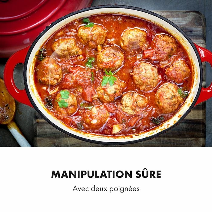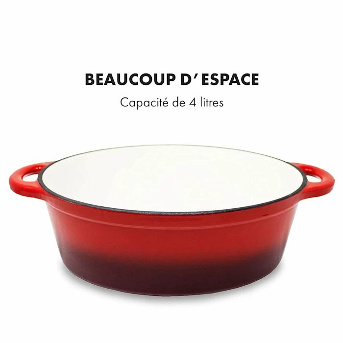 Un véritable polyvalent dans la cuisine : la sauteuse Klarstein Podolica est idéale pour rôtir, braiser, cuisiner et cuire au four. La cocotte ovale Podolica est en fonte, ce qui assure non seulement une bonne rétention de la chaleur, mais la rend aussi particulièrement durable. Grâce à son revêtement émaillé coloré, elle attire le regard et est particulièrement facile à nettoyer. La grande capacité de 4 ou 5,5 litres offre suffisamment d’espace pour vos recettes préférées.
