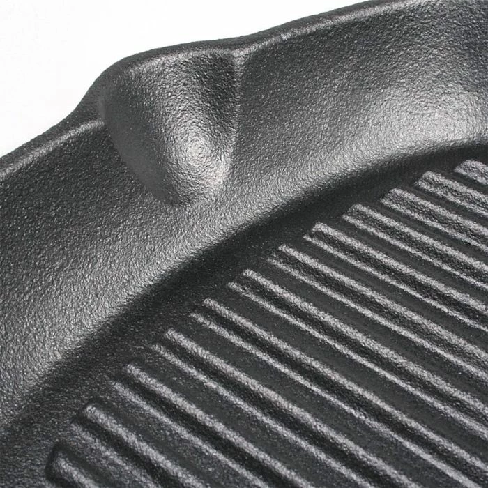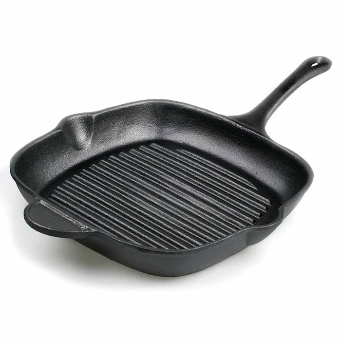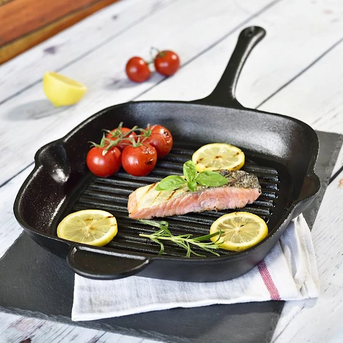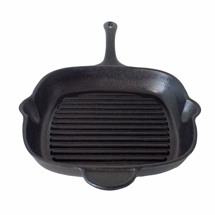 Durable et d’usage universel : La poêle à grillades Klarstein Malvi est fabriquée en fonte robuste pour une répartition optimale de la chaleur. Sur la cuisinière à la maison, dans le four ou pour la cuisine en plein air. Idéal pour les steaks, les saucisses, les pommes de terre sautées ainsi que les légumes et les plats à base d’œufs. La base nervurée offre les rayures typiques des grillades. Le Malvi est déjà pré-cuit et prêt à être utilisé immédiatement. Pour une manipulation facile, la poêle à frire est livrée avec une housse de protection en silicone pour la poignée.