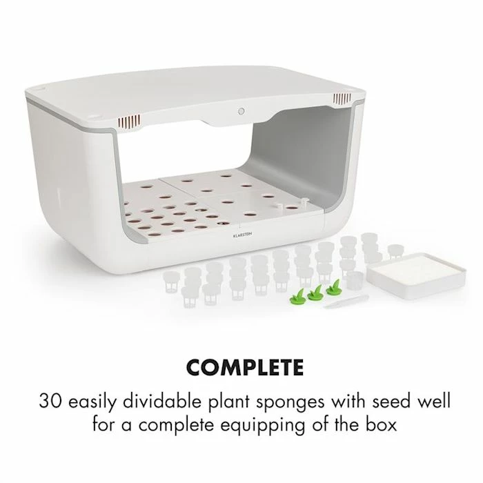 Après la récolte et avant la suivante : avec le plateau d’éponges de plantation, votre système de plantation Klarstein GrowIt Smart Indoor Garden sera prêt pour le prochain semis d’herbes, de fleurs ou de légumes. Le plateau se compose de 30 éponges à planter facilement séparables, chacune avec un puits à graines pour le remplissage complet de la boîte hydroponique.