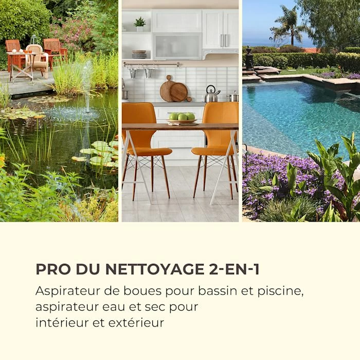 - Une piscine ou un bassin propres : aspirateur à boues pour éliminer les feuilles, la boue et la terre du fond des bassins et piscines
