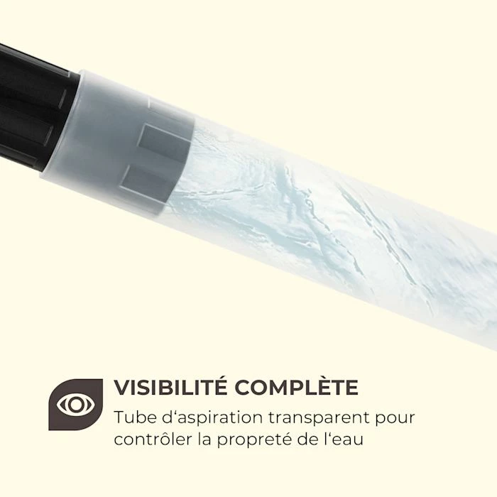 - Visibilité complète : tube d’aspiration transparent pour vérifier la propreté de l’eau