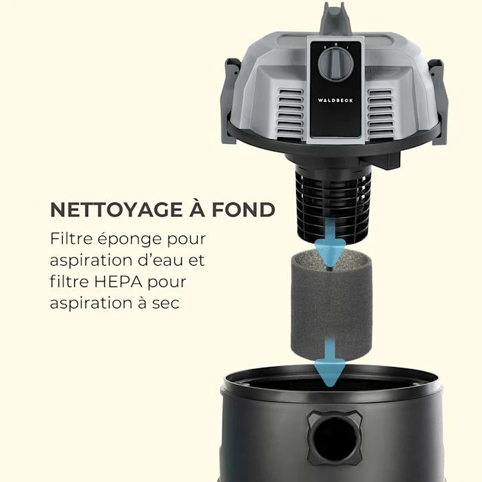 - Nettoyage à fond : filtre éponge pour l’aspiration de liquides et sac HEPA pour l’aspiration à sec