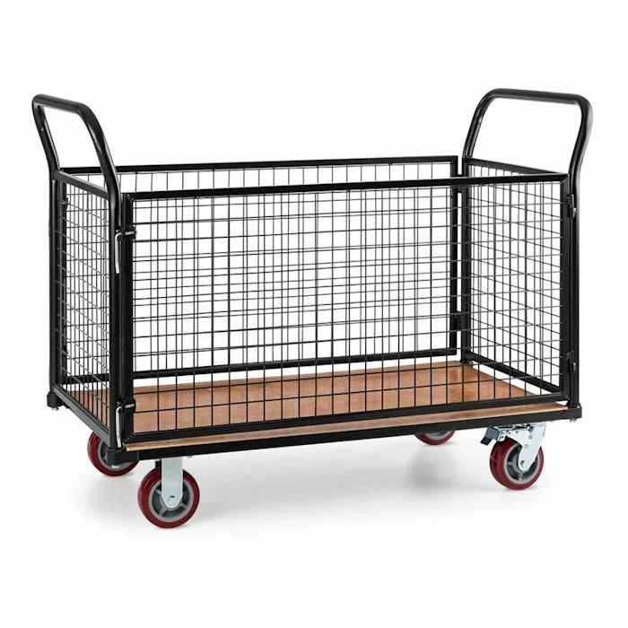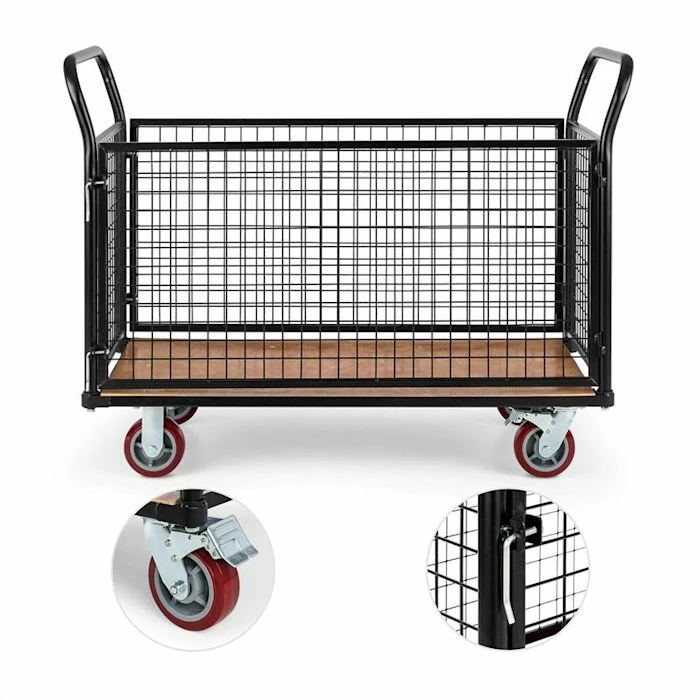 Le chariot grillagé Waldbeck Loadster transforme en jeu d’enfant les problèmes de transport dans les entrepôts ou le domaine de la logistique. Sa conception en tubes d’acier de 3,8 cm de diamètre avec façade et parois latérales en grillage soudé est extrêmement solide et supporte facilement des charges jusqu’à 500 kg. La planche de support également très solide en contreplaqué collé et étanche de 3,4cm, vous permettra de transporter de lourdes charges en toute tranquillité. Le cadre entier ainsi que les parties grillagées sont recouvertes d’un revêtement pulvérisé noir, qui protège le chariot contre la corrosion et les chocs.