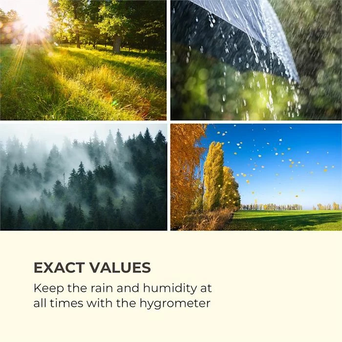- Valeurs exactes : surveillez les précipitations et l’humidité à tout moment avec l’hygromètre